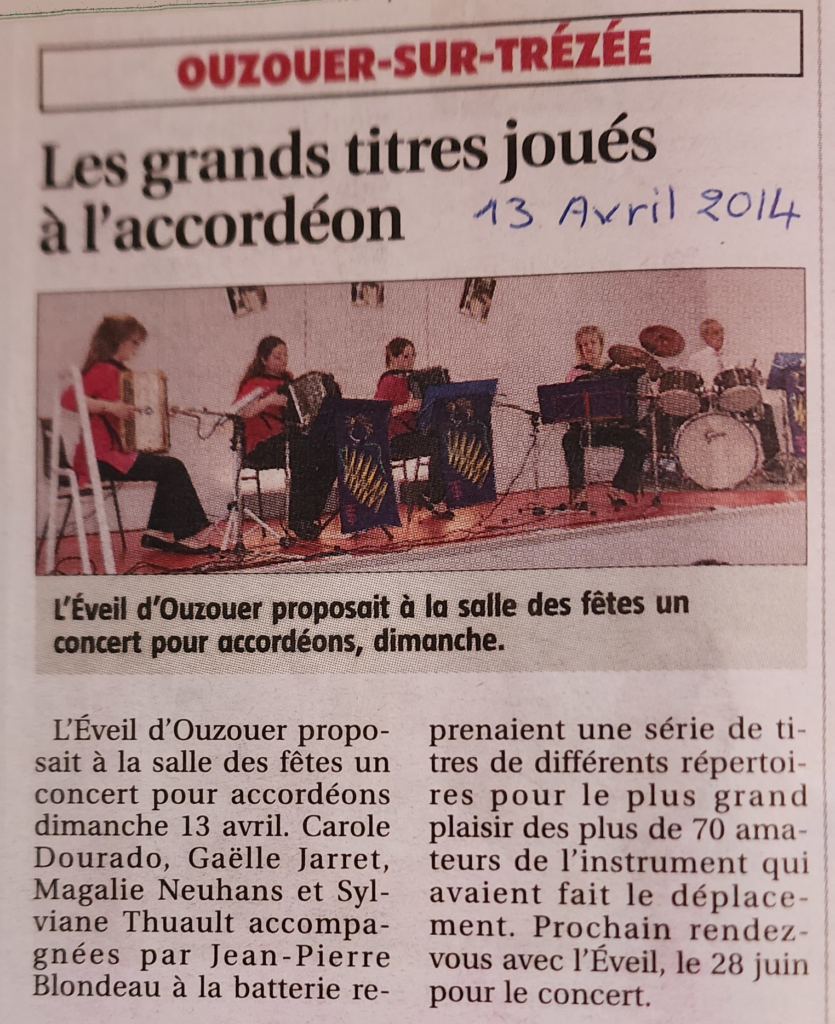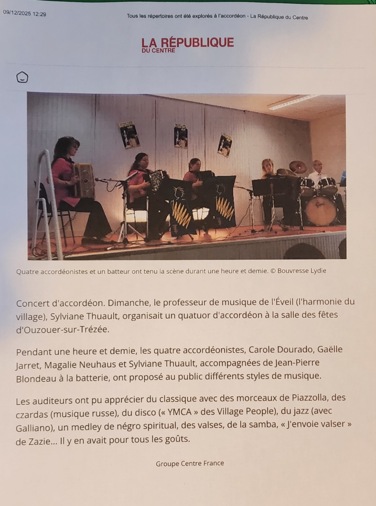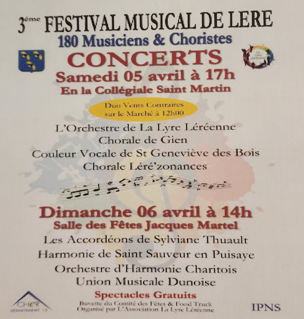 Témoignages / Presse Témoignages / Presse Concert 2025 à Ouzouer sur Trézée Festival de Léré - Dimanche 6 avril 2025 (Haut Berry - Val de Loire) Fête de la musique de Gien 2024 Fête de la musique à Châtillon sur Loire 2023 Consert à Saint Privé 2016 Concert à Ouzouer sur Trézée 2014